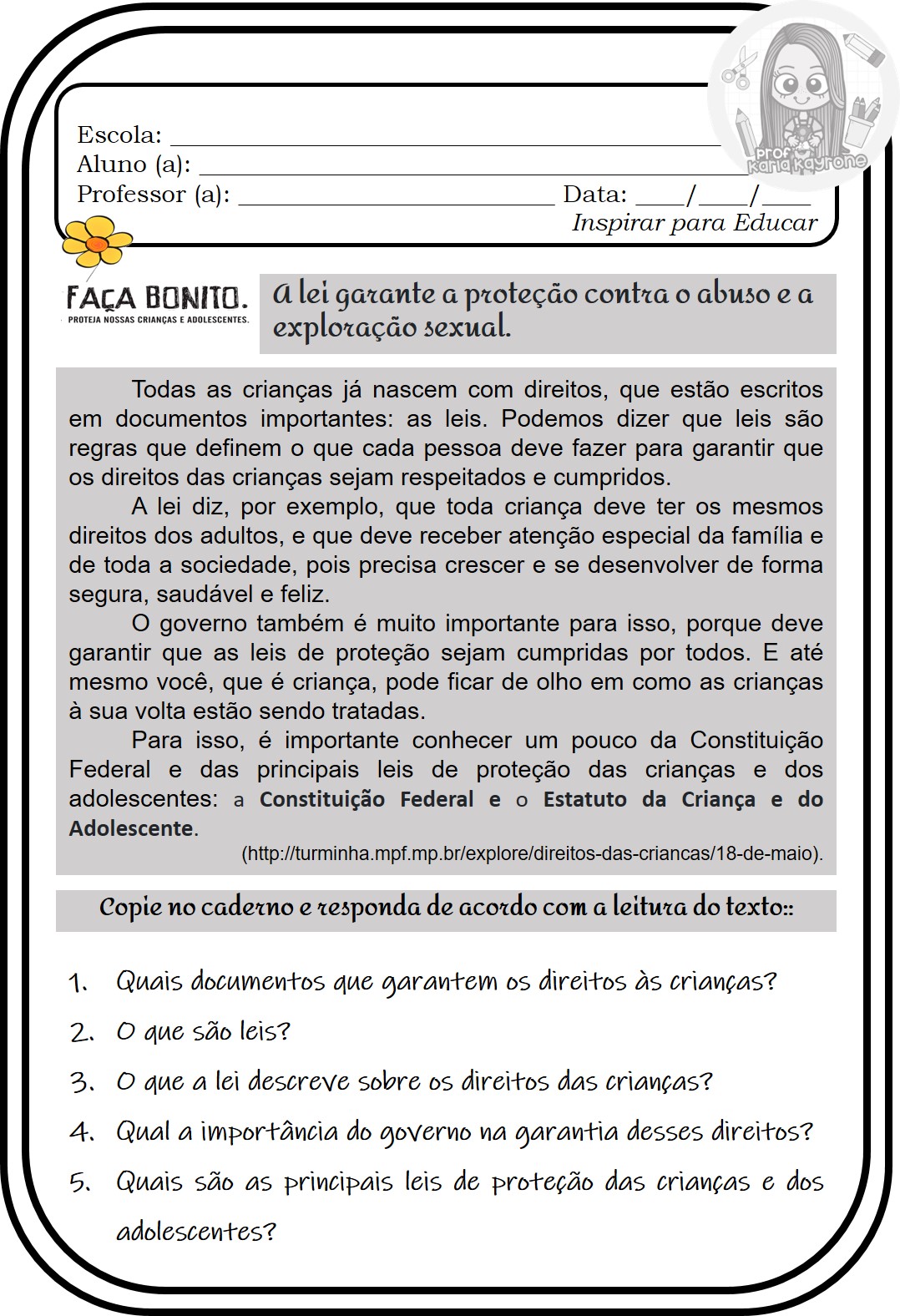 Passando para deixar uma ótima proposta para trabalhar o Dia Nacional de Combate ao Abuso e à Exploração Sexual de Crianças e Adolescentes nos anos iniciais do ensino fundamental.