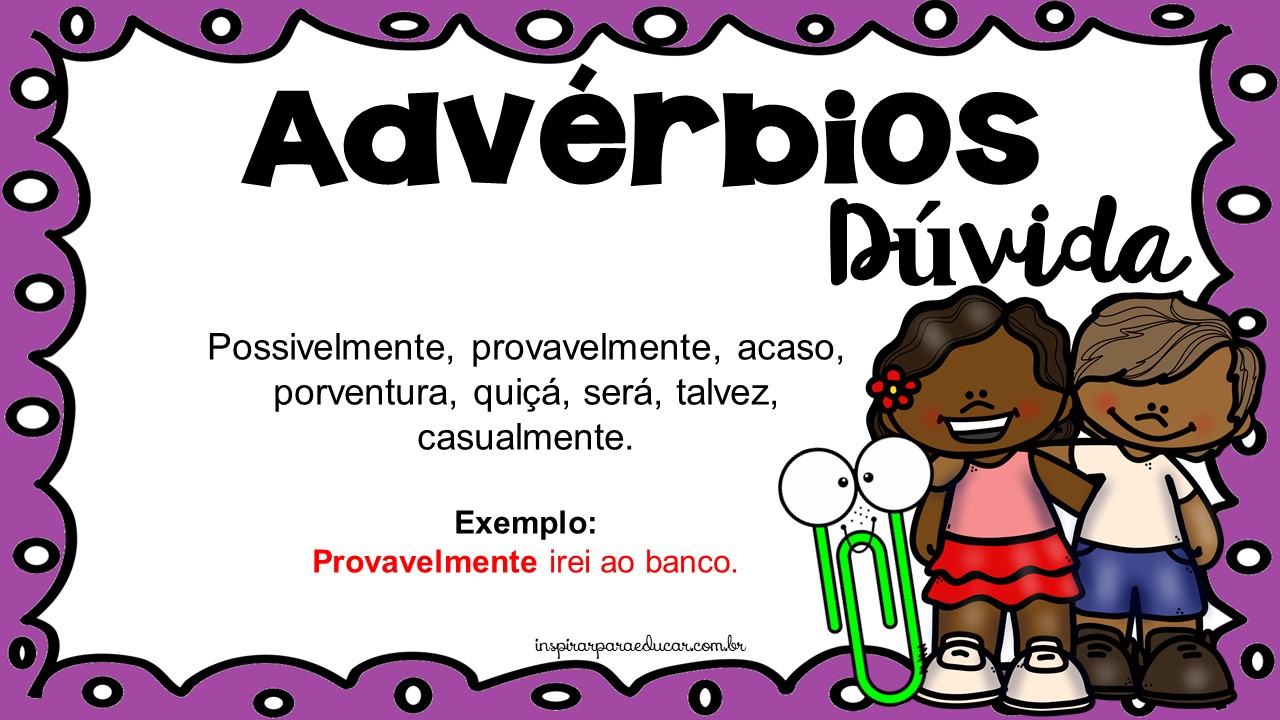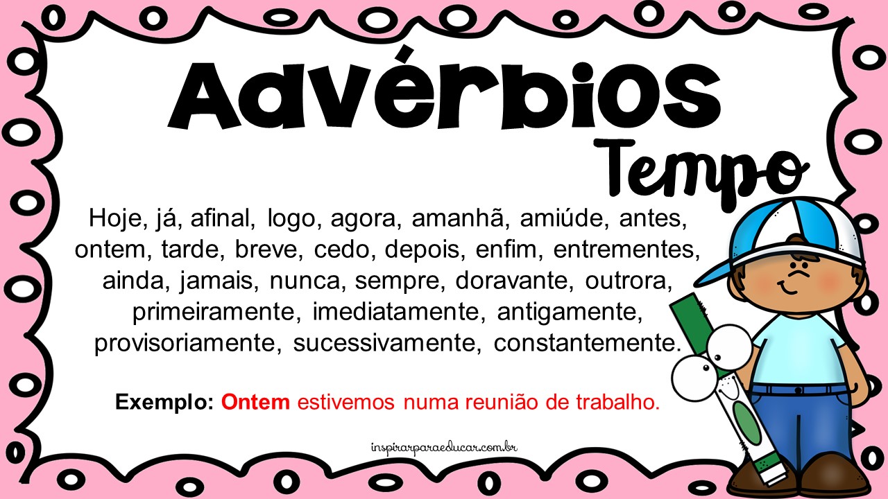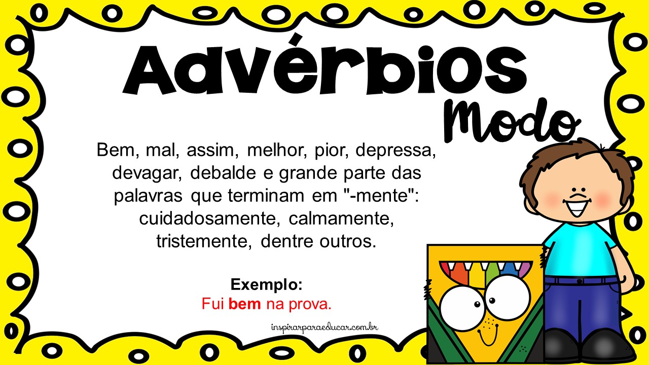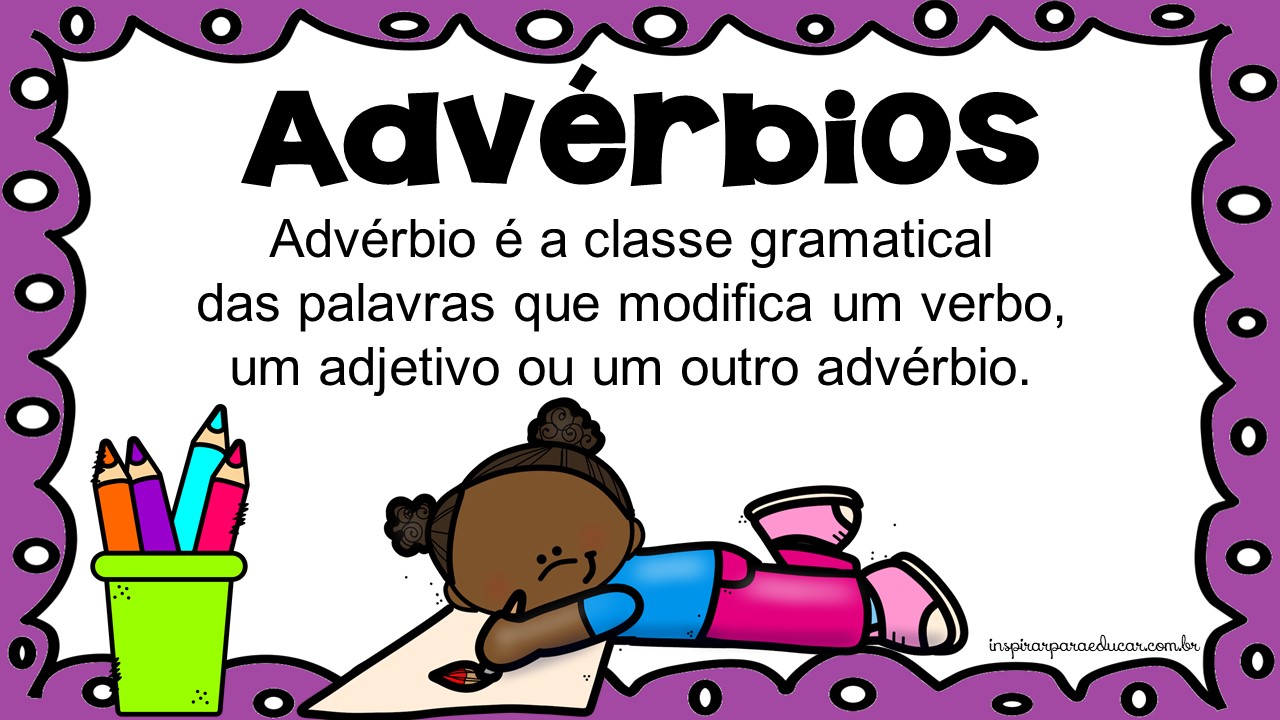 Estou trabalhando com minhas turmas do 4º e 5º anos o conteúdo sobre advérbios, então produzi cartazes para fixar na sala de aula e servir de auxilio para que as crianças memorizem com mais facilidades e consigam possivelmente dominar o assunto de forma dinâmica.