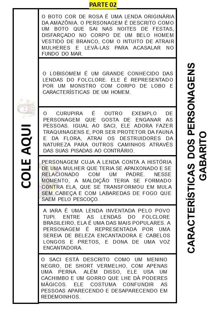 - 01 atividade interativa com as características dos personagens (acompanha gabarito) que podem ser utilizados ou o professor poderá optar por deixar que cada aluno faça a pesquisa.