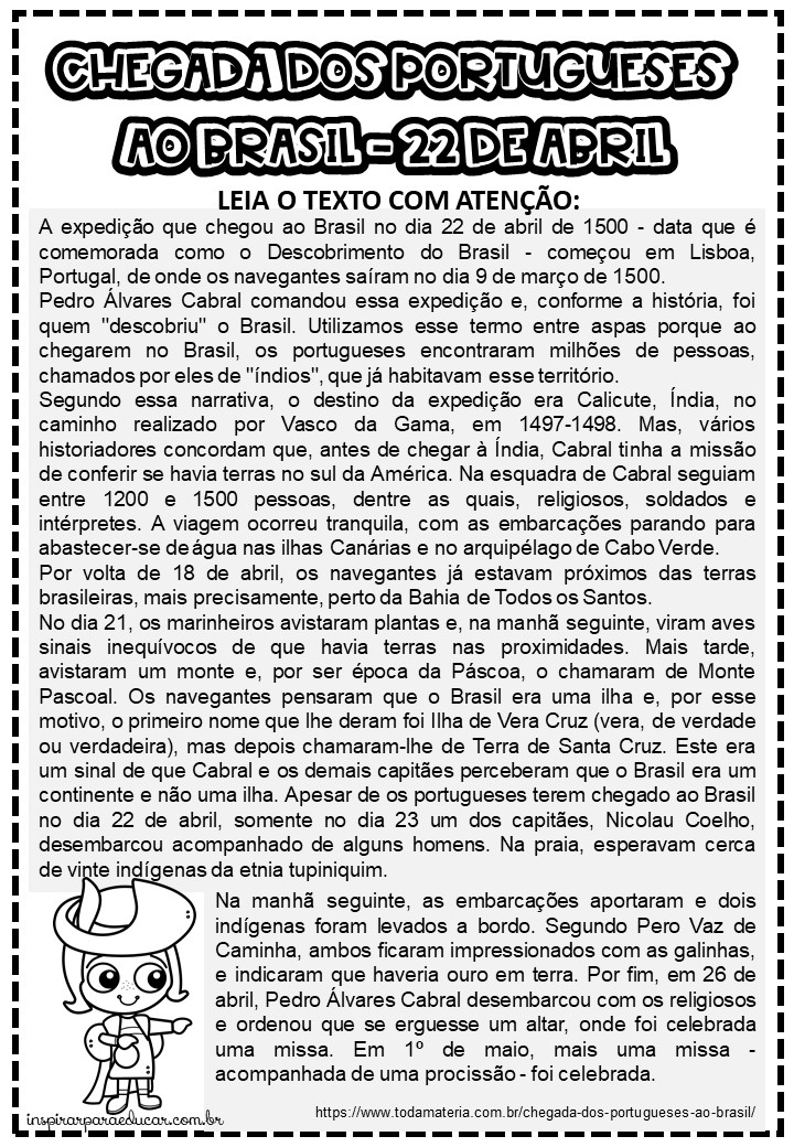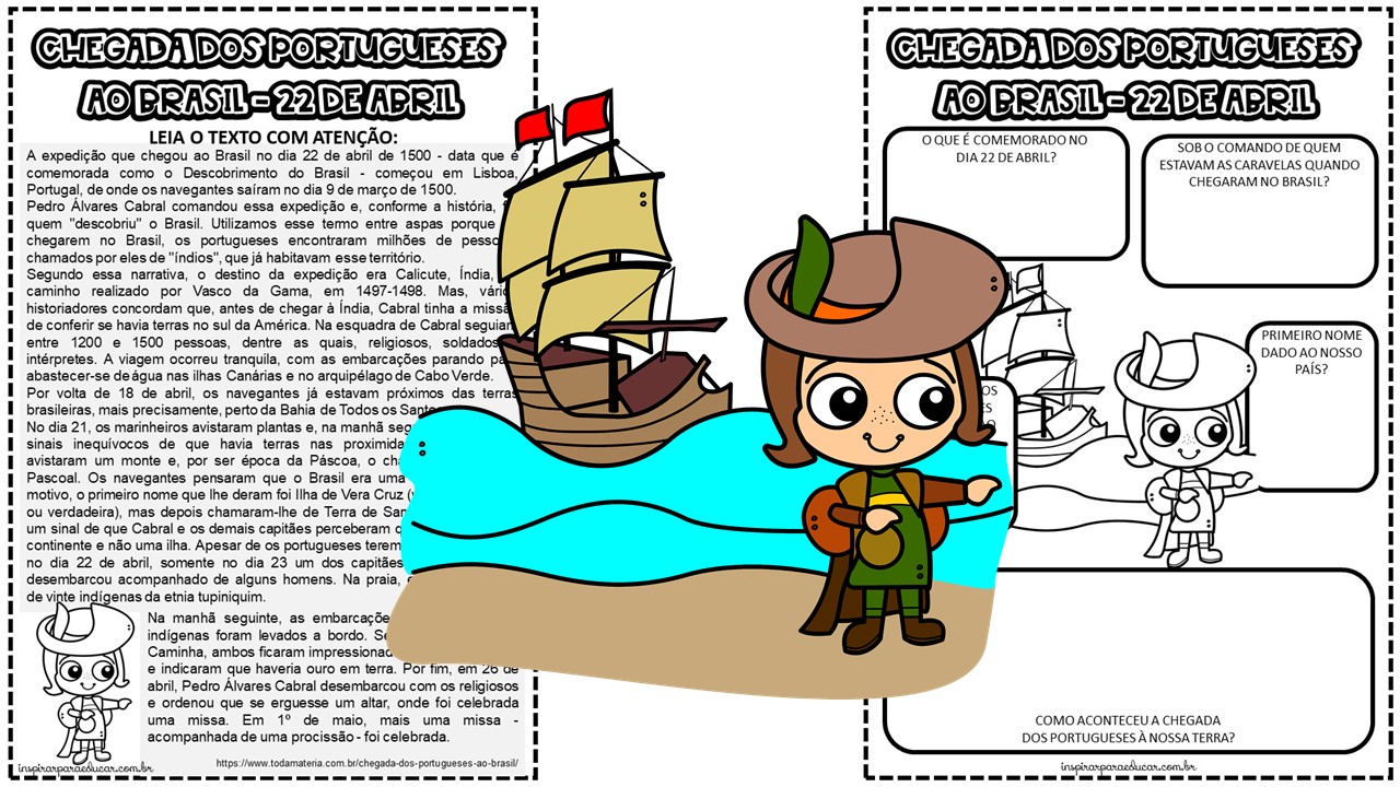 O dia 22 de abril de 1500 marcou oficialmente a chegada dos portugueses ao território brasileiro, e esse evento é muito conhecido como “descobrimento do Brasil”. A chegada dos portugueses aqui foi um dos momentos mais marcantes das grandes navegações, realizadas por eles durante todo o século XV. A partir desse acontecimento, a presença portuguesa no território foi constante, embora pequena no início. A partir da década de 1530, medidas colonizatórias foram implantadas aqui. Pensando nesse momento histórico e de grande relevância para nossa país criamos essa atividade com uma texto para contextualizar com a turma, introduzindo a leitura e a oralidade com uma mapa mental para fixar melhor o que foi estudado.