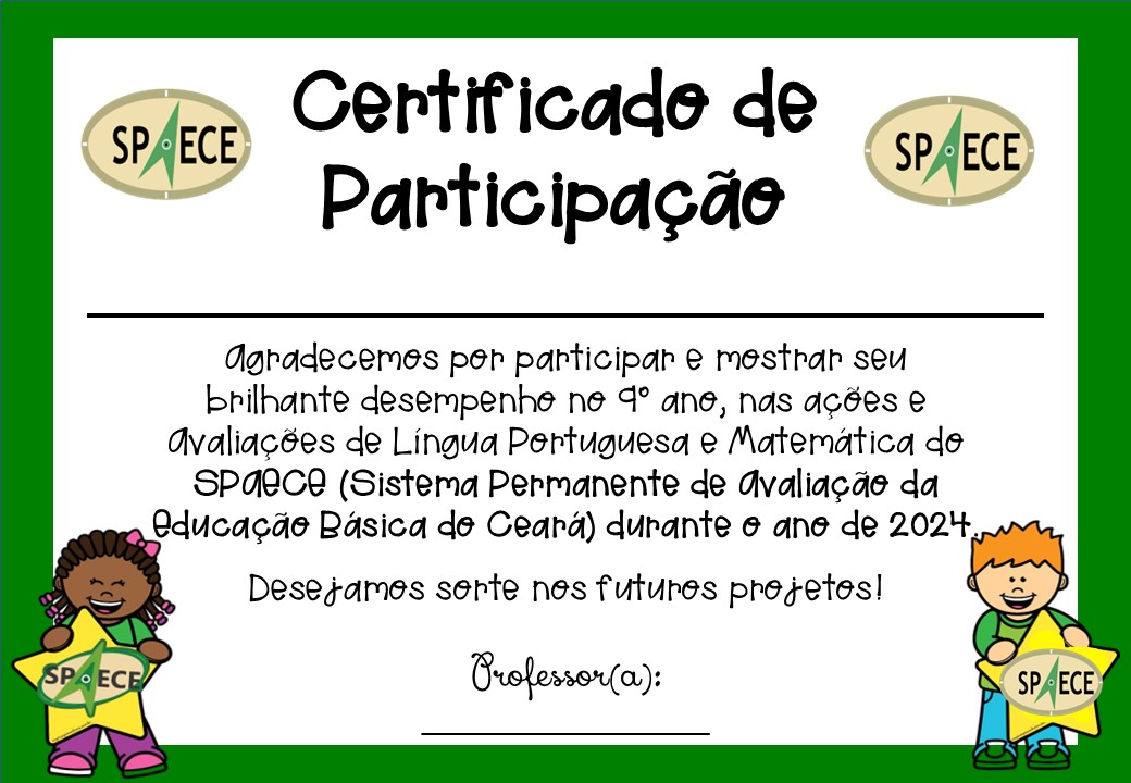Fiz esse certificado de participação para entregar aos alunos na reta final após o Spaece. São muitas ações, simulados e o tão sonhado dia “D” do Spaece e pensando nesse período de muitas batalhas, confeccionamos esse certificado para agradecer o compromisso e a dedicação desempenhada por cada aluno.